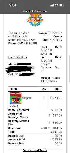 Read moreI utilized this business for my daughterâs first birthday party on the Fourth of July. The party was scheduled to start at 12 PM. I was initially given a delivery window of 9:00â10:00 AM, which was then changed to 9:30â10:30 AM, but they didnât arrive until almost 11. And everything was set up around 11:30-40ish. It cut things a little close, but no big deal. I rented two table/chair packages, a generator, the concession combo, and the pink combo. Iâm not overly picky, but the moon bounce had black debris and leftover water balls left in it, clearly from a previous event. Once again no big deal it was a holiday weekend.