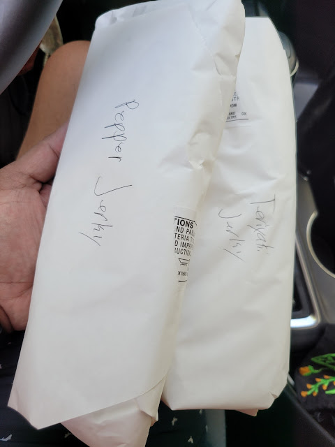 We decided on a couple apple sausages until they provided sample of the pineapple sausages, which were smoked and delicious. We added the pineapple sausage to our list... We also got a half pound of both the teriyaki and peppered beef jerky - delicious.