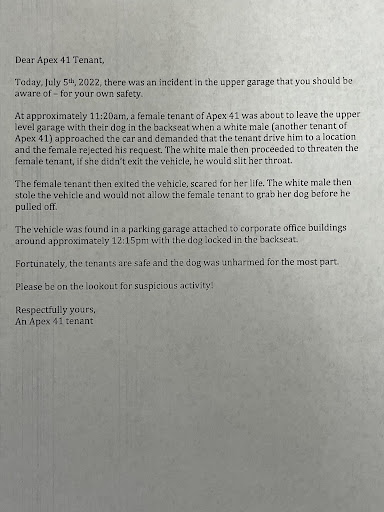 Tenants getting attacked in the building by other tenants. We had an incident in July. Have a written letter from the tenant attacked which is the way the entire building found out about the situation. Management did not care to inform us nor send us any sort of updates. I reached out to Peter-Regional Manager who said they were âwaiting for the infoâ and then never informed us about what actually occurred or how the situation is being handled on our end (in terms of removing the tenant who caused the safety issue or addressing our safety).
