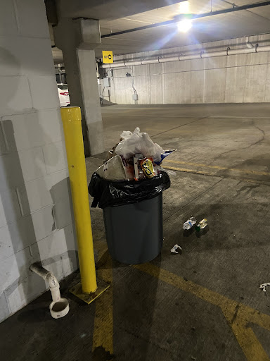 Overflowing trash in the garage bins. Because of that, trash all over the garage spreads. No one cares to pick up. Place is absolutely filthy.