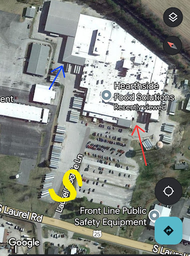 Read moreI delivered plastic packaging here that would be for bags for food. You'll have to first stop at a security guard shack right there on the entrance which I have located with a yellow "S". Receiving is where the red arrow is but since I was not delivering food but vinyl or packaging for food I delivered where the blue arrow is which is normally the shipping area.