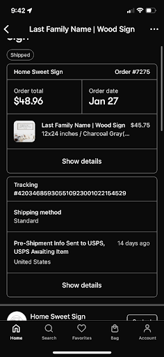 SCAMMING CUSTOMERS Please do not waste your time ordering here. I ordered a simple wooden sign that had our last name and established under it for our entry way. I ordered through here because it said my order was guaranteed by 2/4. A few days after placing my order I received a tracking number and update so I was super excited as my item had been “shipped” with that being said when I click the link it said it was a pre shipping label and usps is awaiting my item so they can ship it. I reached out to the company via email 7 times probably more at this point but the last I counted it was seven, I’ve called them numerous times for them to not answer, I reached out to the Facebook page only to receive a automated reply from Milos, then I reached out to the Instagram where Milos replied and said he would be back to me that day about my order status and I heard ABSOLUTELY NOTHING so I messaged again only to receive no reply, I’ve messaged several times since then, reached out to the automated chat bot on the website and that says my order is being processed. It’s been over two weeks since I received a shipping notification and over two weeks since they took my money without me receiving a order or a basic decent human reply if I’m sorry we forgot to make your order or whatever the case may be. They have horrible customer service, and I am not the only one to experience the bad customer service because upon deeper digging I found others with the same issues as mine. Please don’t give them your money...