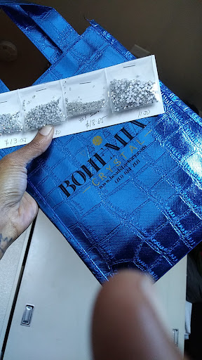 Read moreBohemian crystals that is located in downtown Los Angeles has such a variety of stones beads and in these photos I’m showing studs for embellishing garments. These are material panels that I’ve embellished with the studs and Crystal stones from bohemian 😁 I Personally prefer hand pressed Embellishments because they stay in the fabric basically forever through wash or whatever form of cleaning because of the four teeth mounts that are the basic Standard backing in hand press studding 💪🏾 And yes there are many other forms of Embellishment in some cases using adhesives like glues and other stud machinery as well in which bohemian does cary some of those tools and materials for other Types of embellishments as well. But for your beading ,rhinestones and definitely stud needs I highly recommend you to step into Bohemian because it’s a great adventure with millions of ideas all around and the store is very organized . iG...
