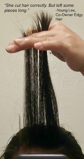 Read moreI found myself at the wrong end of a transaction with a business with less than honest intentions. Solely based on reviews, I felt good about scheduling a haircut with Penny. But, as soon as I arrived home and really looked at my hair (and face and white top: plastered with cut hair. re: white top - she just had me put the robe over my clothes at the chair)...the realization that I did not receive a proper haircut started to dawn on me. I went in for a long layered haircut (this is not a new-to-me style; it's been my hairstyle for years). Next thing I noticed is that she starts thinning my hair. No cutting or shaping. Just thins... I remember seeing her digging in her rolling cart looking for something...did she not have her tools there?? For the entirety of my haircut, the only tool used were the THINNING SHEARS! No wonder my hair looked hacked. But, everyone makes mistakes. I went back the following morning to make things right. Young Lee, the other owner, started to lecture me on what a layered cut is supposed to be... but, after a couple of passes through my hair, he claims Penny "cut my hair correctly but left some pieces long." His next appt arrived and he says something to the effect of it's better and, so, that was the end of my time with him. I did thank him for his time. He spent approx. 10 mins on my hair. See pic (taken after both Penny and Young cut my hair). Yes, my hair is better than what Penny did, but, is it right? even a haircut? what I asked for? paid $80 + $20 tip for? I also phoned Penny a few days after requesting my $80 back...she told me she was busy and would call the next day...to this day, no call from Penny Lee of Edgy Hair Salon. The best way to prevent a bad haircut from happening is to avoid getting one in the first place…I would avoid Penny...