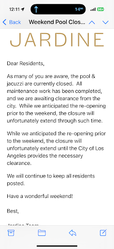 Jardine was always my dream apartment from the moment I saw it. The first time I came over, was to visit LA so I was staying with my friend who lived in Jardine. The second I was dropped off, I knew this apartment complex was in a different league from the available Valet, and private round about location with Netflix buildings surrounding. Then when I walked in and told the extremely friendly Concierge that I was there for my friend, stating her name, they knew exactly who she was. Which showed me just how tight nit this community is that the concierge knows every resident's name. So they called her, to let her know I had arrived I was then guided by the concierge to her apartment, with the security points surpassed by their on hand FOB key. That's when I realized this apartment complex was way more secure than any other . You needed access to enter the front door to the building, in the elevator to access the floor, and of course the apartment with a specific fob key. It truly felt safe, which as a woman is a huge priority. After going inside my friend's apartment, I was blown away by the quality of the features in the apartment. Starting with the kitchen, which has the most beautiful appliances I've ever seen. It was simply my aesthetic from the cupboards, to the marble slab, to the back splash. Then to go to the bathroom, the shower transported me to a Spa with its water pressure and design. Specifically the lighting in the bathroom is my favorite, with an ambient light and a motion detecting light available. Even the toilet fit the aesthetic of luxury. The blinds of the apartment was something I noticed as there was not the typical vertical plastic blinds that I'm used to having, but rather a blackout or sheer, depending on the room, horizontal fabric blinds that elevate the space entirely. The apartment is absolutely flawless. It's so rare that I could see myself instantly at home , even though I was in my friends apartment. I went with my friend to look at the amenities that Jardine has to offer, when I went through the green house and saw my most favorite feature, the coffee machine, with Kombucha on tap. In all my years I have never seen that before within an apartment lobby. I actually felt like I was in an alternate reality where an apartment complex was built for specially me and my personality. I was already impressed by Jardine, but the kombucha was the cherry on top. The coffee itself is such an ideal feature, with it actually being quality coffee, unlike the underwhelming coffee usually available in hotels. The best part, is it's free. Cappuccinos, espressos, lattes. . I didn't need any more information to know that Jardine was the place I needed to be. This interaction took place about two years ago. When finally moving to Los Angeles, the only apartment on my mind was Jardine. I contacted Juan Gonzalez, and he was the leasing agent that made my dream come true. He was there with me every step of the way. It wouldn't have been possible for me to live in Jardine if Juan wasn't there. His kindness in responding to all of my questions , and knowledge of anything apartment related really sealed the deal. Moving in was extremely easy. It's now been a month since I moved to Jardine, and I couldn't be happier. I didn't know then when I visited, but Jardine hosts events in it's Movie Room. These events are so that residents can be introduced by staff, specifically Kenz Meadows . This is where the community is born. I got to meet so many residents in an hour, which is huge considering I didn't even know my neighbors in any of my past apartments. We all bonded and watched the Superbowl together. Kenz Meadows is how that is all possible. She creates these social events. She knows every resident by name and truly puts in the effort to get to know them, including myself. She makes Jardine a social community. I now am able to go around and say hello to so many residents I met at the event because of her. I am so happy to live at Jardine. I never want to leave. ...
