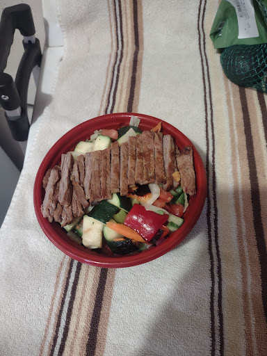 The beef was not tough and tender enough but was devoid of flavor and apparently not marinated. I added A1 sauce when I returned home. The Shirazi was good as were the vegetables which contained zuccini and red pepper which is high in vitamin C. However, I don't like eating iceberg lettuce because it takes 3 days to digest.