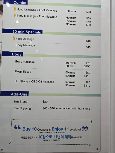 Read moreI’ve tried plenty of massage spots in Koreatown, but this one is on another level! From the moment I walked in, I felt at ease—the space is spotless, beautifully designed, and radiates a sense of calm. The service is exceptional, and Kevin worked magic on my back, melting away all the tension and soreness. I left feeling lighter, looser, and completely refreshed. Plus, the little touches, like the clean, comfortable clothing they provide, make the experience even better. This place is an absolute gem, and I’m already planning...