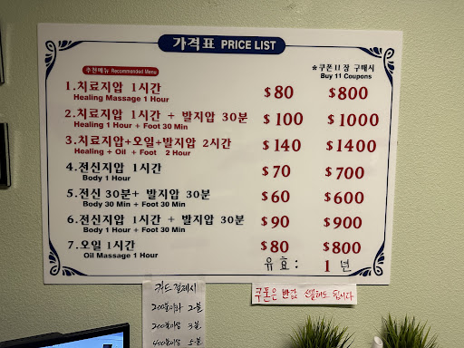Read moreFantastic place!! Best ever massage!! Nothing better than Candy (masseur), and her magic feet and elbow (see attached image:)) But really: me and my wife go every week for an 1-hour couple massage. Candy and Steve provide us with heavenly, super professional, precise, healing massage. My muscles never hurt afterwards, even though it can be pretty intense sometimes. — This is a place where masseurs go to have massage!!! — Hidden gem in LA. — If you’d like to heal and refresh and get best massage of your life, please try!! They are very lovely, very hard working, very good people — speak mostly Korean and Chinese, but no worries: scheduling appointment and payment etc. is possible in English also. — Environment is also suitable for a great pro massage. — Me and my wife are very addicted to massage since decades. So we tried a Million places, but this is one of the very best we ever found. Super-grateful for finding this gem, and it is well worth the 1 hour drive for us every week from Palos Verdes / San Pedro area. — Gamsahabnida, Candy and...
