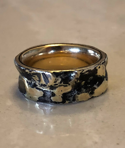 This is a custom wedding ring made by Bunny Bedi at Made in Earth. The inside of the ring is my grandpa's wedding ring, and the outside is a custom gold and oxidized silver ring. After working on several custom designs that involved a little more cutting and reshaping, I saw a similar oxidized ring in the Venice store and said "that, but with grandpa's ring on the inside" and Bunny made it happen.