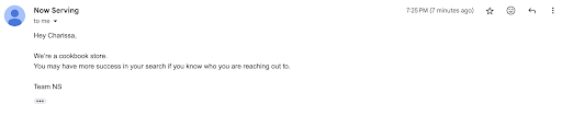 Read moreExtremely demeaning and crude. I do not know who the owner is but their team is condescending. I accidentally emailed their store due to their SEO being altered to match a particular search, in my situation a search that included "NOW Magazine La." I realized the error when I received the automated email stating they would return my inquiry as soon as they could and the signature mentioned they were a cookbook store. I was already embarrassed and assumed I'd receive a kind response, from an actual person, letting me know of my error. Nope. The NS team decided to put me down and imply I was an idiot. What is wrong with people? Is it really that difficult to be kind? Who's initial desire to a simple mistake is to be mean? Are you that insecure that you get off on putting random strangers down? I guess so. As I mentioned in my response they are selling more than cookbooks, they're also selling unwarranted negativity. Attached is...