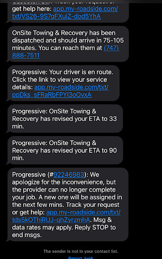 At this point I've had it. I had no more water, my phone was less than 10%, and I was stranded by myself away from home! Immediately after that last call, I tell my dad to call them and Nicole immediately told him that our insurance canceled the tow (another lie). Which is insane because two minutes ago she told me another 20 minutes. It's crazy I only found out about the cancellation because my dad called! She never had any intention of calling me to AT LEAST let me know so I can figure something else out. It's honestly such an awful thing to do to someone in a desperate situation.