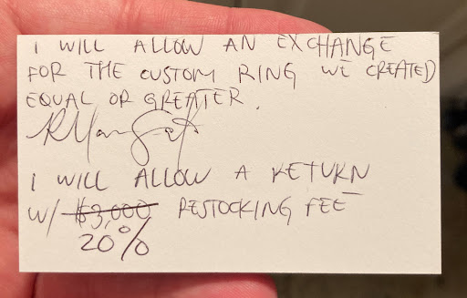 DONâT BUY FROM HERE When I considered buying an engagement ring from Robbin Brothers, I already had a template of a ring my fiancĂ©e wanted. I went into the store looking to purchase a ring with a round diamond band and a cushion stone and halo. The jeweler explained that the ring can be designed to look like the template I had. The jeweler said we can make a custom halo to place in the top of any band. He explained he can "Open it up and drop the halo in and close it up." Those are the jeweler's words. After looking at a few alone bands to design an engagement ring on, I liked a diamond band that was designer made and ready to go (premade). The band I chose was thin and smooth and was fit to be made into an engagement ring. Fast forward to when the ring was made and I got it, not only was the halo the wrong shape (round) for my cushion diamond, but the jeweler went on his own terms and changed the band I picked from the start to a band that is bigger and just straight out unflattering. He customized the whole band to his liking. "Making it thicker to protect the diamonds from falling out." Jeweler's Words. The purchase for the band already came with a diamond protection if they fall out anytime for life they are replaced. This being a diamond band that was premade by a designer jeweler and then sold in the store comes with protection for the diamonds. I donât need you to worry about the diamonds and not ask me to make that sort of extreme custom change to the plan we had originally discussed. On top of that, one of the sales reps asked to see the ring as I was picking it up and decided to TRY ON the ring to see it on herself to PROVE that it will look good on her hand! That is beyond unprofessional, there is no reason why ANYONE should try the ring on except my fiancĂ©. This is a fine example lack of attention to the customer's request when it comes to caring for the expensive purchase I made with you, to how that now decreases the worth of the band as it has become a random person made ring rather than a designer made one, and to sticking to the agreement we had in place to make the special ring I showed a picture to the jeweler and he said he can do it. The picture was from a jeweler in Australia. If you were wondering why not go there, itâs because I would rather see the ring after it is all done. I did here and I told them that they changed the band, and the halo is not the right shape, size, and really thick. He cannot use gold for any sort of craft if you cannot tell a circle from and slightly curved off square (cushion). He should go back to wood carvings that way its less expensive to practice on. As the custom work was not what I had asked for I asked to have my money that I spent on the ring back and they respond back with "IF it was less than $15 THOUSAND DOLLARS, we could have worked something out, but..." SO there is a max spending limit before they will work with you on refunding you any money back? Attached is a signed card of the General Manager, REZ, stating our agreement at closing hour. The next day, he changed his mind on any sort of restocking option, I am just stuck with a $14,837 ring that I did not pick out or ask for. Notice how it has $3,000 scratched out and 20% in. Its cause the going rate to restock is "15-20%" (which he stated, I verified online, and then he had the audacity to ask me "where I got that percent?" I told him you "You just said it and I checked it online.") but he was cutting corner and not doing the percent, but rounding it up and doing a flat fee. That was very sketchy to me. You are telling me one thing, doing another, and asking me how I got here? There's no reason I should be stuck with a $15,000 ring, that is nowhere near what I asked for, with the fault of no one but the jeweler. Why state you can execute a ring confidently, when you clearly can't! The Jeweler and the Customer Service at the facility is very corner cutting and do their own thing when it comes to making a change to a ring and to the price you pay for your ring. So literally everything! DONâT...