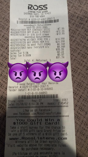 Read moreDon’t support this Ross Sherman Oaks- cashier doesn’t support other women. On 3-8-22 at 6:50pm a cashier let a customer (male)go in front of another customer (female) who was first in line. An argument ensued because female customer was defending herself asking cashier why she isn’t taking her first. Then male customer hit the female customer hard on the arm twice! Cashier didn’t say anything or intervene and even gave the female a hard time - because she was hit in the arm and because she was first in line!? Cashier denies seeing this happen in front of her register! Security guard , or loss prevention was nowhere to be found so they did not help the woman. If corporate wants to step in and reprimand the cashier by all means here’s the receipt and go look at your cameras maybe facial recognition can get this male customer behind barz. You can’t touch a customer by law- and especially during COVID people don’t want to be touched so learn self restraint and control. Until then don’t come here they apparently are antiwomen and they will...