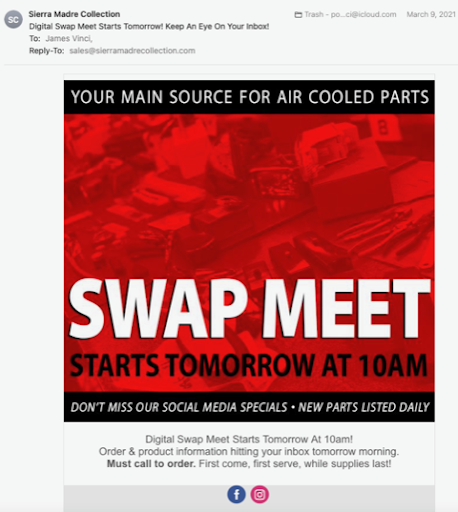 The purchase I made from their âon line swap meetâ on 10 March, for my 356, included 2 carpet trim pieces and a 356 âreplica tool bagâ. Unfortunately the black dye on the tool bag had bled onto the white interior of the bag and left it with black blotches on the interior lining which made it ascetically unacceptable. I called Sierra Madre the day I received my order and spoke to Hunter Johnson who said that it stated that it was a âscratch & dentâ sale and therefore they could not do a price reduction, refund or replacement. After I reviewed the documentation regarding the âswap meet saleâ, and found nothing stating it was a âscratch & dentâ sale, I forwarded that documentation along with the pictures of the tool bag with damage to Hunter for his review and edification.