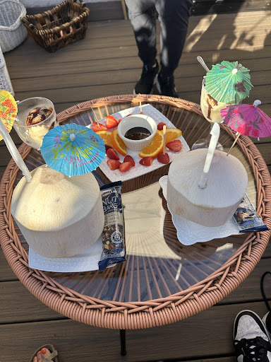 For the grand finale, we went to the patio for chocolate strawberries, nut bars, ice cream, and fresh coconut juice! My partner was so pleasantly surprised to end this experience with fun treats and the smell of the ocean! Kayla even came back with a special oil to help with his injury - 10/10 customer service! They encouraged us to take our time and relax on the patio. To be honest, we didn't want to leave!