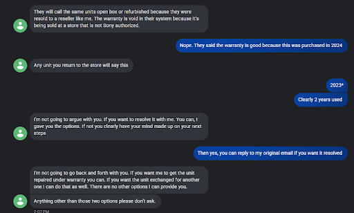 I went to Sony and they confirmed it was a refurbished TV that was recycled and was sold initially in 2023 (Not new at all). If I bought this TV knowing it was refurbished, I would take the warranty repair. However because I was sold incorrectly, I asked for a refund and the owner keeps making excuses when I keep providing him evidence. I also tried to go along with him asked to do panel refresh and stuff like "well just don't touch the TV" acting dumb that he has never seen this TV do that before.