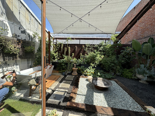 The studio is placed in a private adaptive reuse warehouse and has an industrial vibe. It's extremely welcoming and warm community and the two owners who run it are a lovely couple who opened the place last April from what I've learned. There's an outdoor shower and one enclosed shower, one bathroom, and one changing room. Spacious lockers and a beautiful outdoor area with an ice bath, feels like a Zen meditative retreat. The studio itself is fairly small fitting about 20 people at most for the practice. The heaters are fairly strong and direct on the guests, but not uncomfortable.