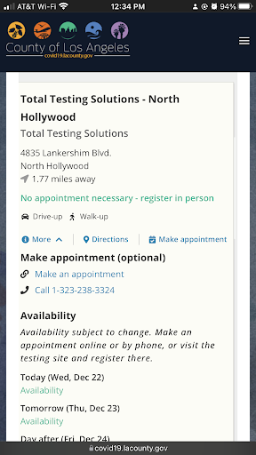 Read moreI'm a little concerned now that I have read the reviews. My partner and I went to get tested at a location in South El Monte. The first red flag was when I received a message that the station would be closing at 4:30pm. My appointment was at 4:45pm and my partners was at 4:20pm so I was told that I can show up before 4:30pm and my appointment will be honored. I show up and there is a very long line. I call to make sure I'm at the right place because there was two different addresses showing and they had told me they stopped letting people in at 4:00pm (Second red flag) Why tell people to come before 4:30 but close the line at 4? Anyway, I still saw people getting in line behind us so I just stayed in line.The line seemed like it was never going to end! We waited for 3.5 hours to get tested. Now 48hrs later and still no results. I understand that it might take longer because of the surge of cases but I see on these reviews that people have never gotten their results because they lost their samples!? Not to mention the first time I called TotalTesting Solution the automated message actually mentions that it's the total testing solutions place but I call again and it says it's the Center of something else (Third red flag!). This is frustrating as my partner need the results for work. I would not trust this place if you're looking for fast testing or...