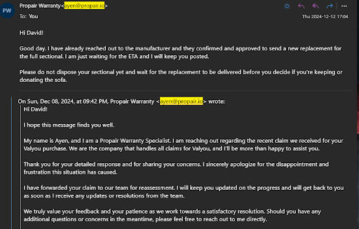 Two days later, we received an email with a tracking number and a delivery date we never agreed to—despite being told they’d reach out first to schedule. At that point, we still had our old sofa and were in the middle of renovations, so timing was important. We emailed the delivery department and got a response from Rose Adao. We provided our availability, but she said she couldn’t guarantee a delivery on those dates. Then, without confirming anything with us, she scheduled delivery for a day we explicitly said we were unavailable. It created a pretty messy situation.