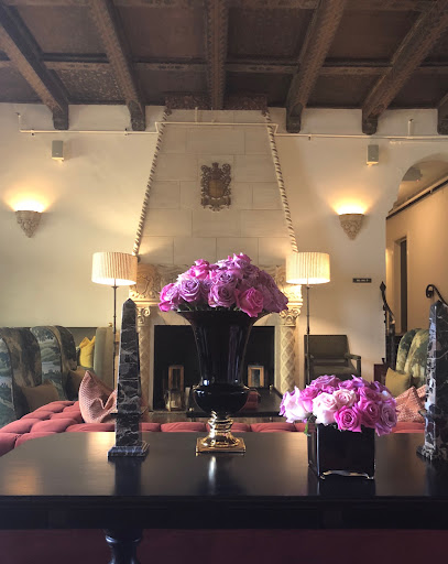 My room is a dream come true and I feel carried away into a fairytale world . It is very quiet here , I am looking at the famous Hollywood sign and onto the top of Palm-trees embracing the wonderful courtyard with the soothing sound of water flowing into the fountain .