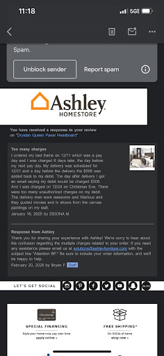 Ā Ā Ā Read moreI think most of our first home is furnished by Ashley at this point. Since this past Thanksgiving we bought a new dining room set, living room sectional, our bedroom set, and last night our son's bedroom set. Buying from this store is way better because they usually have sales/discounts that aren't available online. The financing offered is usually more in store as well if you go that route for any purchase. Looking at all the furniture stores in our price range Ashley had the best quality and design choices hands down. Until we can afford somewhere like Arhaus, this is aur choice lol. The only thing I don't love is the high pressure commissioned sales tactic of the protection plans. It's irritating when you say a firm no that they ignore you and "call the manager to see what they can do about the pricing". Do not love that. Then they take money off the furniture set but only if you buy the protection plan. I really hate that, but I get that's more corporates fault for making that a necessary part of their paycheck. It's no different than any other high pressure sales tactic, it's just not something I expected the first time I wanted to just walk in and make a quick purchase. Other than that the employees are helpful and nice enough aside from the salesman stuff. We look younger than we are based on dress and behavior, so we often have people assume we don't have money for a large purchase, and they didn't judge us based on how we dressed since you can't judge a book by the cover with us at all. Love that. The delivery is a crazy cost as well when it should be free based on the price of the purchase. It's free during some promotions, and not others. Don't love that. Don't love all the super high costs of all the stuff normal people would need for a large purchase like this (size and cost). I know it's common practice though which is why online purchases are taking over. There's usually free shipping on the website though, so you'd have to consider the price between the two if you utilize the $350 approx delivery. That's without install or putting it together. That's at least another couple of hundred. Thankfully my husband and I own a 4x4 truck and he's very handy otherwise I probably would have purchased online for some of my purchases. We also got free delivery on the only purchase we used it for during a sale that offered it. That wasn't great. They kept postponing the delivery date and wouldn't let us switch to pick up. So lots of not great things from the corporate end, but it's still our choice for the best quality at the best price in Louisville. We don't buy from...