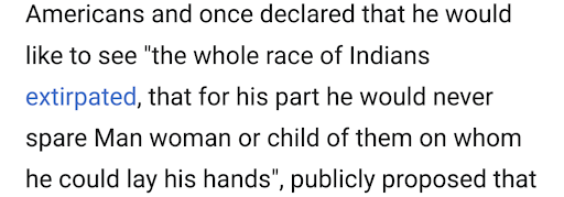 Nowhere is this information available at your museum. In fact you describe him as a great negotiator with the Indians. He advocated for genocide. He would feed children to dogs.