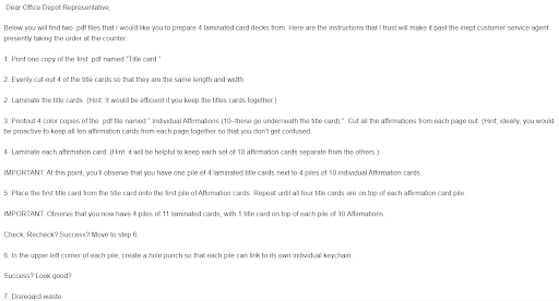 As a part of my charity work, every year I make gift backs for the Suicide Prevention Hotline, I came to Office Depot to print out and laminate Affirmation cards. I waited while they were no customers at the printer desk for 5 minutes while Shelby stood there, aware of my presence, but apparently doing some chores or other work. I watched her turn and walk away from me to the other side of the printer desk, where she greeted a new customer who had just arrived. I watched her greet the new customer, so I stepped behind that one and "waited my turn." (In this location, she'd have to grasp that I'm also customer, right?). After another 3 minutes passes, that customer leaves, and I step up to the counter, hopeful that I would get assistance this time. I set the example set of cards down to demonstrate what I need. As I reach for my phone to show her the printouts that I need, she invites the next customer up, effectively dismissing me, just as file pops up. I tell her, "I've been waiting for 10 minutes for you to assist me. I was here before the customer you just helped and these 3 customers who just showed up behind me. I'll leave and come back when they are gone." I leave the store and come back 10 minutes later. 8.It's empty. I approach her and ask if she "had time to attend to my request now that she wasn't so overwhelmed with customers?" No answer. No smile. No apology. She looked away in evasion. I explained to her that I need these two files printed, cut, and laminated. I asked for the email address. She pointed blankly to the desk with the address on it. Given her demonstrated lack of verbal communication, I adjusted the instructions in my email, making them *extremely clear so she wouldn't get confused (see email below). She goes to her computer, looks at it, and tells me its not here yet. (I double check the email address. It was sent correctly). "I expected as much given the circumstance. I'll wait." I wait for 30 minutes in an empty store while she goes about her business, forgetting I'm there until I catch her attention, just staring...waiting...for her...to complete her assistance. She goes to the computer, "it's here." She looks up and asks if meant to complain about another customer service provider in the email, one that she hoped I had talked to before she arrived. "No, I said. "That was a detail I left for your manager, who, like I said, am hoping executes these projects." She asked, "What you wrote about the person being inept?" I said "yes, that was my judgment of our encounter, from start to finish." (It was a single line in the email) She told me she that she is not going to do the job and asked me to leave because I was rude. Frustrated, but not surprised, I said, "You've been rude and incompetent the last 45 minutes, 40 of which I should have been at dinner with my coworker." She threatened to call the police. I asked for her name--Shelby--and then I left. At the car, I realized I left her with my example card deck, so I went back in to retrieve. Unsurprisingly, she misplaced it, so she couldn't give it to me. I said, "this one is for the books" and I snapped a picture of her (specifically for this review, and my letter to corporate--to build context.) She threatened to call the police...again. I said, "wonderful, because now you're withholding my property. I'll send my coworker to retrieve it." 10 minutes later, my coworker goes into the store, requesting the sample card deck I left in Shelby's care. Shelby was no help---again. So my coworker spoke to the manager. While the manager reviewed the tapes, Shelby "found" the cards. The end of an unnecessarily painful, slow, and insulting non-customer service experience from Office Depot.