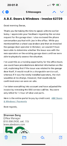This is a follow up review to the one above.Here is what happened since the above review. I received a call from a very polite lady at ABE Doors and Windows. Excellent verbal skills.Her name is Shannon.She apologized for my bad "phone " experience with the service repair call for my garage door. That was the least of the issue. There was no mention of them being at fault.I ended up with a garage door that no longer could function twenty minutes after the service call. One might ask what might she have said? There were three possible options for this company to at least try to make it right. 1. We would like to refund the $145.00 dollar service charge. ( the very least of the options) 2.We would like to give you a 50% discount on a new Garage Door Opener Unit. 3.We are going to replace the unit. Well nothing like any of these things happened, so I got an apology. Talk was cheaper for them. Well a very wise and brilliant business man told me long ago "it is how you finish in life that counts. " I add to that it is how you finish in anything that really counts. So in the final analysis my negative review still holds for not calling them for Garage Door Repair.