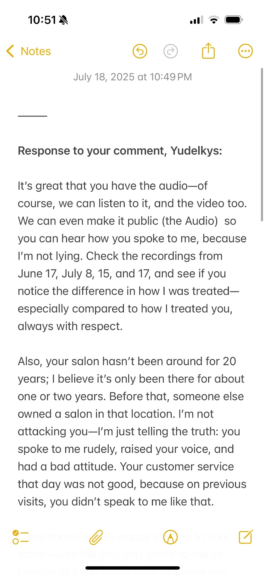 Honestly, I don’t understand why I was treated with such aggression. I’ve been to the salon four times, always pay what’s owed, and I leave generous tips (never less than $20). It’s truly unfortunate that a business that depends on customers doesn’t prioritize respectful and professional service.