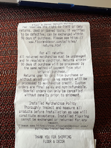 All these hoops to jump thru for products that they have in stock... their receipt even states that "returns over 90 days from purchase or without an original sales receipt will be processed to merchandise credit." While I understand that they have the "right to limit or deny returns", these items were still in their unopened boxes. They claim to empower their store managers to create a local shopping experience... if this experience is what you desire, visit the Countryside, IL location. While I liked their tile and selection, it will the first and last time I shop at Floor & Decor.