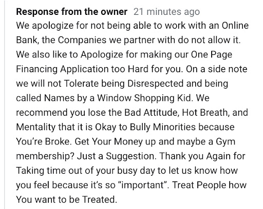 First off let me start by saying that I have never encountered a situation like this before I felt so bad once I left. When I enter the store there was no air conditioner at all it’s literally boiling hot in this environment. I’ve never shopped at this store before, but my relatives have so I was a little confused, So i needed more information. I walked over to the individual that was working there , I’m not sure if he’s a manager or the owner I honestly do not know. I asked him a couple of questions because I wanted to know the process on getting the furniture, This guy gets literally offended because I said, I would rather shop at Aaron then shop here because there’s to many hoops to get Furniture. So let me explain, I have a chime account okay, he informs me they don’t take chime, I guess they don’t consider it as a major bank ok cool. So I said instead of going to open another account with another bank I’ll shop somewhere else like Aaron. From there he just lost it, he wouldn’t help my relative at all, they were asking him for prices on certain items, he was saying just go to Aaron like he didn’t wanna help at all after that. Oh yeah he informed if i posted my review he would drop a video by it. You guys I hope he does, I hope he shows you guys the whole video so you can see how he was acting towards my relatives. But it was a terrible experience, never again. Update!!! You guys he left a review and you see for yourself his disrespectful comment. No real owner would say this stuff god bless this store. I screenshoted his comment...