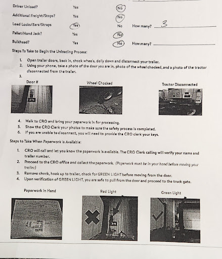 Read moreIt's a Wal-Mart DC, and my expectations are not in and out with a live unloaded. Check-in is slow. Come at least 45 minutes before your appointment. You can't come an hour before, there is no truck staging area, no overnight parking, but it is small and the workers here are nice enough. The last time I was here, it took 2 hours from my appointment time to check out. Open your doors, back in your door, slide your tandems, disconnect your truck and pull away from your trailer, chock your wheels, then go to the office and drop your paperwork off. Do I need to tell you put your trailer dolly's down? LOL new thing is you need to fill out a paper: name number etc..., and take pics of 3 things, the door your in! You chocked wheels! Your truck detached from your trailer. Pretty soon you'll be unloading and checking...
