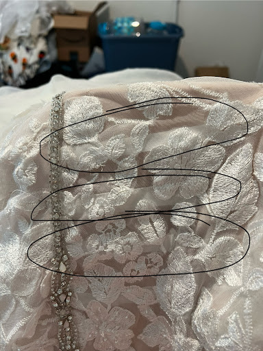 Now onto alterations. 7 months later, my dream dress is now ruined.. I became pregnant a few months before my wedding. Im only 25w pregnant. So not a huge bump or anything. They told me there was no problem come in 6 weeks prior to get it fitted and altered. All that was to be done was fill in the see through area, remove boob pads because they were way too small and let the dress out an inch on both sides so I had wiggle room if needed. Simple right? Wrong.. I had to go find fabric at Joanâs because they didnât have any in stock and they couldnât promise theyâd get the fabric in on time. The worst part is itâs their Champagne color.. so 1 of their main colors in some of their dresses.