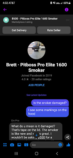Read moreNot impressed with the customer service. I stumbled across an ad on Facebook marketplace for a nice refrigerator, but when I opened the comments I was quite turned off at the hostility the seller demonstrated towards other customers. It was absolutely unprofessional and a complete turn off for me, which is a shame because my husband and I were looking for a similar model to the one posted. I should add that when I brought this up to the seller his immediate response was “good for you” and then proceeded to block me. It’s incredibly immature and unprofessional. I hope others don’t experience this lack of...