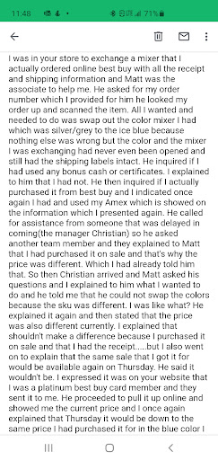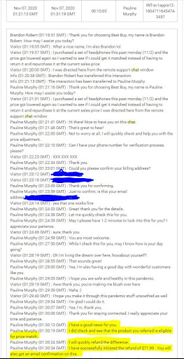 It pains me to be so negative but I have had the absolute worst experience with this location in particular and Best Buy in general. I purchased an item on 11/2 that went on sale a couple days later so I initiated a price match via the online chat on 11/6. They told me the item was eligible and I would get an email confirmation once the refund was processed.