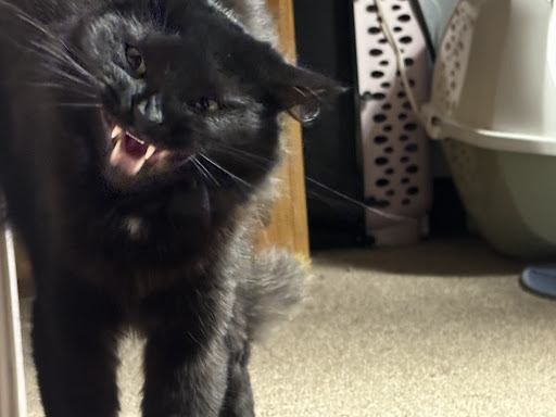 In the next 6 weeks, I was able to determine that the cat was terrified of my very mellow, cat friendly dog! He started marking with pee and poop all over my house. The only time he used the litter box was when I had him quarantined alone. He saw my vet and got a clean bill of health. We tried all kinds of litter, cat pheromones, 3 litter boxes all over the house. Nothing worked. (BTW my vet aged him at 3-5 years old) He was clearly not happy in my home and I sadly surrendered him back to Darbster.