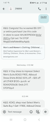 Br prepared for some confusion if you choose to use the texting discounts over 7999. As a first experience with K&G, there was admittedly some frustration with a cashier who repeatedly stated 'the suits are already on sale,' when asked why the $5 discount was not being used. Perhaps I can't read the fine print of that text that said the $5 discount was only for full priced items. A previous guest also mentioned that they get you with alterations. We have found that to be true as well. Maybe we're just still wet behind the ears, but there seemed to be some liberty taken for the services rendered, which were not actually required or asked for. Watch out for the $10 creaset on each suit. That adds up pretty quickly. Then again, we aren't the demographic K&G is looking for. We're going to make these suits last a lot longer than they should, because we can't afford to get...