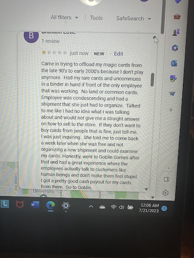 The third visit is where we learned the guy from our first visit was the owner. We show up, and to our delight, Chris is behind the counter! He immediately remembers us, welcomes us back. This time we were here to make some major purchases because, after selling a good bit of our collections to fund our move across the country, we were ready to get back into competitive commander. We asked for one of each fetch land and few other key pieces to fill out our crazy combo decks. We were easily to over a thousand dollars in cards between our respective piles. So, we busted out our trade binders, to help lower the cost on our end, but were ready to spend some serious money. Cue the owner walking out of the stock room. He sees our piles and that we plan on making some trades. He takes over the sale from Chris. Chris explained to us that he is the owner and likes to conduct the big trades. Okay, understandable! Then it moved downhill from there.