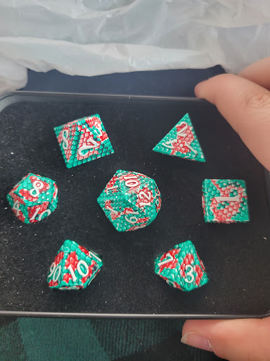 Dice were kept in easy view of the cashier and they have an incredible variety to choose from, including what looked like a partnership with a company to sell store-branded dice sets.