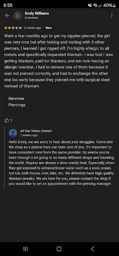 Ā Ā Ā Read moreIf you have an allergy to metals, do NOT go here to get pierced. They are not APP certified, which means they aren't held to high quality standards, including hygiene, quality metals, and other best practices. I'm writing another review because it wouldn't let me edit or respond to my previous review. When I initially called and asked about the issues I was having with my piercings, I was told to go to the doctor. I don't know who I talked to, but when I explained what was going on and asked if I should come in for them to take a look, she told me to go to the doctor, I can't help you.. this is why I went to another piercer and found out they lied about the metal put into my body. When I called back a second time and asked about the metal, she told me they only have surgical steel and are in the process of phasing it out.They lied in response to my initial review and said they definitely have high-quality titanium, which they don't. I'm very allergic to any metal that has nickel in it and SPECIFICALLY asked the piercer if it was titanium. Instead of lying and piercing me with steel, they should have told me, we don't have titanium and recommended another piercer. I had to take one of my nipple piercings out because it was done wrong, and after I exchanged the other one for actual titanium, I've had no issues. I don't appreciate being lied to, especially online lying to everyone else who might have this issue. So, no i will not be coming back to have consistent care from the...