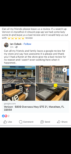 Read moreThis store is an independent run store. When I was away my minor son went into the store and they allowed him to purchase a phone under my account. He did not have my authorization. The manager lied and said the girl that helped him did get my authorization. That was not true because I was in another country with no cell phone service. After talking to a Verizon representative 800 number. We found out they illegally sent a code to my minors sons phone sons cell phone to allow him to authorize, buy a phone and change my account. If it was not for the Verizon representative 800 number, I would have never gotten this issue resolved and everything credited. She caught them in lies and unethical behavior. They not only let my son purchase a phone. They charged over $500 in a buy out, activation fees and several other charges were incurred. Update: Apparently the upper manager didn’t like my google review. He posted on social media pages. I think this is very unprofessional especially since they did something...