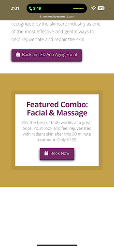 Read moreAbsolutely best decision to take a break from the beach with a massage. Seya was amazing and I asked for lomi lomi which was so relaxing and she combined it with the perfect amount of deeper working out of my muscle tension. The entire massage was heavenly but if I had to pick a favorite part it was after she worked my neck, she put a warm pillow under my neck and a cover over my eyes. I was just lulled into a sleepy abyss of relaxation for the rest of the session. I can’t recommend Cosmo Day Spa enough and they had appointments available right away, so no need to plan ahead...