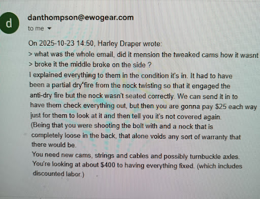 Read moreMiss eds archery, my dad's crossbow exploded three shots after new strings. My wife's crossbow limbs are cracked after new strings. I miss Steve and eds archery this is a sorry sorry replacement. Two bows broken after around ten shots. Coicendence I think not. Hicks replaced limbs on the ten point for a lower price then easternwoods outdoors discounted rate. Save your your money go to Hicks. Update(11-10-2025 easiest way to spot a liar is when the stories don't add up. You've don't more to hurt your own reputation just by replying. Attached below is a email thread not stating anything about arrow weight. First bow. Eastern woods would not even supply the email thread from ten point to which I've called. And they said and I quote that there is no way to prove that the bowshop was wrong. Meaning they can overcrank your bow in a vice crack limbs and charge you for the repair. So either eastern woods doesn't know what there doing with bows or they have bad help. Two bows both basically both broken one bow shop same vice. Glad nobody got hurt but be careful and let this post be a testimate to anyone who has been scammed or worse injured by poor workmanship. So again save your money go to bens or Hicks and Steve from eds archery if you ever read this we the...