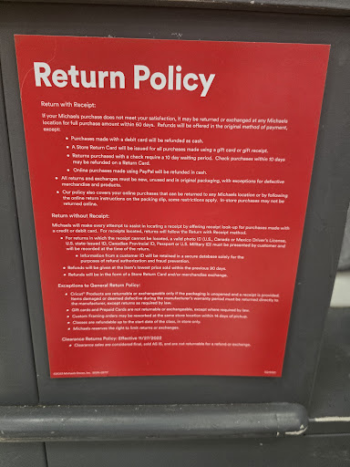 I recently visited this Michael’s location to return an item I purchased just two days prior. Before coming in, I checked the store’s return policy online, which stated that a return could be processed without a receipt as long as I provided a valid ID and the card used for the purchase.