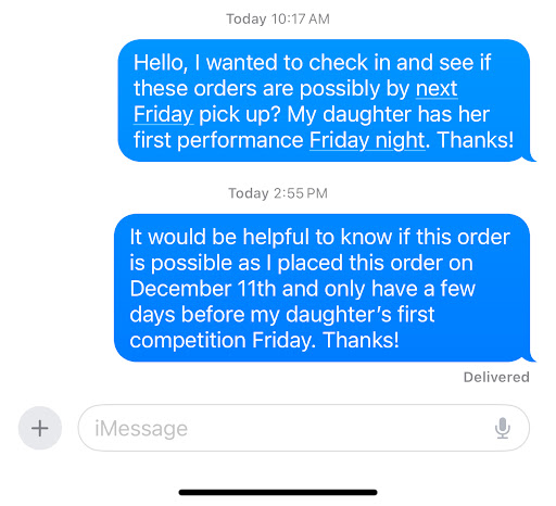I would give - zero stars if I could and not sure how the owner manages to keep her doors open with her non existent customer service. Trying to keep my money local and support small business I placed my first custom order the first week in December for an event the following week responded that she could make my design no problem. As the event approached and several attempts to reach out no response so I gave her a little grace understanding she may be busy with the holidays approaching and even showed up at her shop and purchased a premade design leaving me without my order for the event. No apology or anything. The worker felt terrible and apologized for her. I said I would like to give her another shot at another order if over a month is far enough an advance and she told me that’s more than ample time. Fast forward to a month later and a week before my daughter’s first dance competition she ghosted me again refusing to respond to texts or pick up her business phone when attempting to see if my order will be ready! Completely unprofessional and blown away how absolutely ignorant she is. Don’t waste your money with this business because she is less than thankful for the support and encourage others to shop somewhere where they actually appreciate it. As another local business owner I will be sure to share my horrendous...