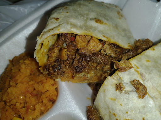 Burrito came with rice and beans and cups of sauce. Red being their hot and green the mild. Prices were fair considering I was not eating rubber bands again like their competitors. Will return again for carry out as seating is...