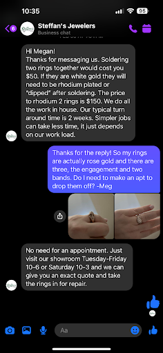I decided to go to Steffan’s to get my engagement ring and two wedding bands soldered together after receiving multiple recommendations due to their excellency in jewelry as well as their customer service. I am overall extremely happy with the work done to my rings. They look amazing. What I am less than impressed with is the customer service and lack of integrity I received from the sale associate Janelle. I went in expecting a two week turnaround time based on the below Facebook conversation I had with Steffan’s. I even asked if an appointment was required and per their below response, one was not. When I met with Janelle she told me the jeweler was on vacation and they had a 3-4 week turnaround time and then gave me a hard time about how I should’ve made an appointment. I then referenced my Facebook message and her less than polite response to me was “the jeweler is a human too and deserves time off, we can have it done in the two week window for a $50 rush fee.” She then told me it would be done by April 24th. I was very insulted by her comment as I never once said the jeweler didn’t deserve time off. My husband just got back from a 6 month deployment, I’m well aware people need a break! I then paid the $50 as I am returning to an area that doesn’t have a jeweler and desperately wanted my rings soldered. I awaited a call on the 24th that my rings were done, it never came. I called on the 25th and Janelle told me it would be done on the 26th. As unfair as I feel the rush fee was based on the below conversation I had, I do think Steffan’s does exceptional work. Their customer service is just lacking with this...