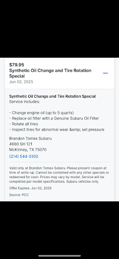 Read moreAVOID THIS PLACE LIKE THE PLAGUE!!! I would give negative stars if that were an option. They will damage your vehicle and refuse to fix it. Service advisors and service manager Kelsey provide sub par service at best. You will go two weeks without any form of communication and they are not easy to get ahold of for updates. After attempts to contact them you will get a text “Sorry I was in a meeting all day”. I have been a customer of Brandon Tomes for 5 years and have given them a bare minimum of $30k+ in work. My 2020 STI threw a rod in April 2025, I was given an estimated 1 month for the repair to be completed. Long story short they had my vehicle for 4 months. I was lied to about eta on parts, I was told they didn’t have any eta and two days later all the parts have arrived, how is that possible? I finally get my car back and there are deep scratches in the quarter panel and the exhaust tips are extremely uneven, so much so they melted the plastic fascia of my bumber. I was told they were going to take care of “ALL” the scratches on my vehicle by Service Manager Kelsey. Not surprisingly I get my vehicle back and they poorly attempted to buff out the DEEP scratches and didn’t even touch another scratch which I was told would be repaired. A week or so after having my vehicle back it is making a strange knocking noise to which I sent them a video and brought my vehicle back. Magically the sound has disappeared when it was making it for two weeks straight before I dropped by vehicle back off with them. To no surprise it is still making the sound again just a day after having my vehicle back. I spoke with Service Director Cody Griffin who told me they couldn’t do anything more and would have to repaint the quarter panel to fix it…. So repaint the quarter panel, you caused damage to my vehicle so I expect you to take responsibility and repair my vehicle. Additionally they felt it was acceptable to return my car to me covered in compound from their poor attempt to repair the scratches which are completely missing the clear now and will likely cause rust eventually. Additionally I found two new dents on my vehicle, front left fender and passenger front door. Cody said and I quote “we will not be taking care of that we have done enough for you”, I don’t see how your poor customer service, being held accountable for the damages you caused to my vehicle and doing the repairs you were paid for are considered doing “anything” for me. Quoting Cody once again “You just need to enjoy your car and stop blaming us for your issues”, my jaw about hit the floor when he had the audacity to say that. God forbid you are expected to repair damages YOU caused to a customers vehicle. He then proceeds to question whether someone had done a walk around of the loaner vehicle and that he wants to make sure there are not damages… Ofcourse you want to make sure to hold your customers accountable for any damages to a loaner vehicle but don’t find it fair to be held responsible for damages you caused to a customers vehicle?! Absolutely unacceptable and horrible business practices, to top it all off my freshly built engine not even out of the break in period which hasn’t been into boost at all has now been to 14.7 PSI, so your employees feel it’s acceptable to joy ride a car and get into boost on a freshly built engine?! I expect this engine will throw a rod within a few weeks now, this dealership is piss poor from top to bottom, I called and spoke to the GM shortly after leaving and he said he would speak with the service team and call me back. To no surprise I never heard back after giving him a full week to get back to me… once again, take your vehicle literally anywhere else. I would trust JIFFY LUBE with my vehicle more than I trust this place...