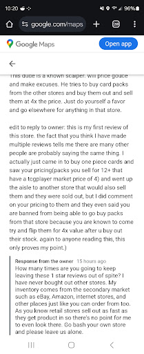 Read moreThis dude is a known scalper. will price gouce and make excuses. He tries to buy card packs from the other stores and buy them out and sell them at 4x the price. Just do yourself a favor and go elsewhere for anything in that store.