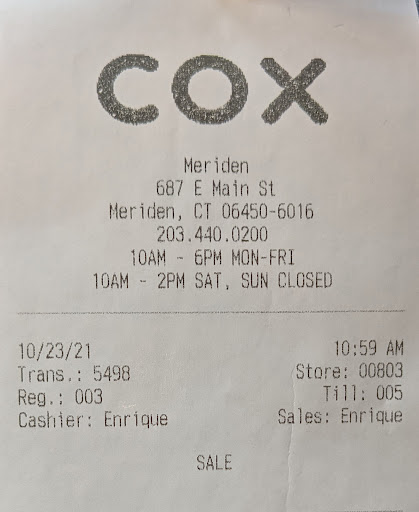Read moreI will put no star at all , it show 1 star cause that’s the only way I can write a review for Hector. I have ongoing issues with my camera and WiFi services for like a week. I went in person to meriden store on August 16,2023. I talked to Hector Morales at the counter, he said he was going to make an appointment to send out a tech and find the problem in fix it. He gave me an appointment for that Friday August 18,2023. from.10am till 12:00 noon. Upon leaving he insured me that the problem will be fix when the text comes out on Friday. Friday came the appointment was between 10 till 12:00 noon, at 11:30 came I still didn’t hear anything from Cox so I made a phone call to the meriden store. Only to find out no appointment made for the tech to come out. I was told from the manager from the store that hector is not allowed to make appointments , you supposed to call it in to Homelife. Supervisor and Manager that Hector should not make appointments for tech. After all this my problem was still not fix. Almost a week later I received a phone called from Hector trying to sell me upgraded, without knowing who he called. We already had everything and more then he trying to sell us. When we mention to him about the mistakes he made before he got nasty and rude and said to us he doesn’t make mistakes then hung...